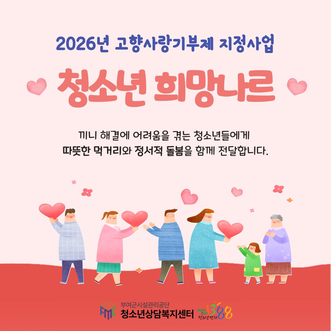 돌봄 사각지대 청소년 대상 맞춤형 지원…지역사회 연계 복지 강화 부여군청소년상담복지센터가 고향사랑기부제를 활용해 돌봄 사각지대 청소년 지원에 나선다. 부여군시설관리공단(이사장 김주희) 부여군청소년상담복지센터는 지역사회 기부금을 활용한 지정사업 ‘청소년 희망나르’를 추진한다고 밝혔다. ‘청소년 희망나르’는 경제적...