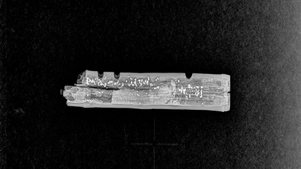 엑스레이 분석 결과 한쪽 끝이 막힌 구조로 확인된 이 악기는 오늘날의 소금과 유사한 형태로, 백제 횡적의 실체를 처음으로 확인한 사례다. 삼국시대 전체를 통틀어 실물 관악기가 출토된 유일한 사례이기도 하다. 문헌 기록과 도상 자료로만 추정되던 백제 음악 문화가 실제 악기를 통해 구체적으로 드러났다는 점에서 학술적 의미가 크다.