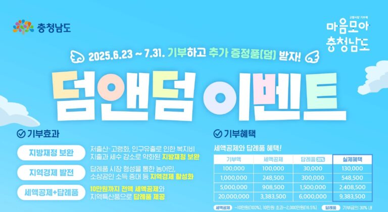 도 관계자는 “올해는 작년보다 더 풍성하게 이벤트를 준비했다”며 “어디에 기부할지 고민이라면, 덤앤덤 이벤트에 참여해 충남의 우수한 답례품에 증정품까지 추가로 받아보시길 바란다”고 말했다.