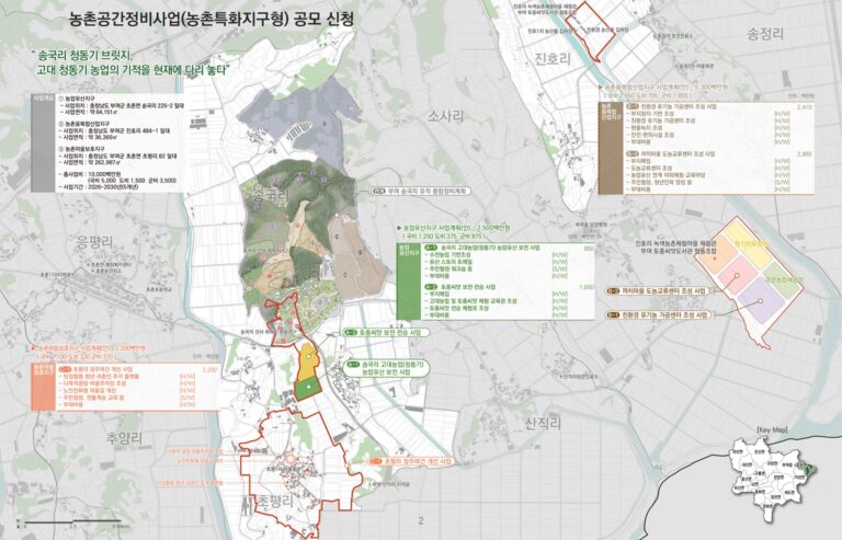 군은 고대 청동기시대 농업의 발현지로 알려진 송국리를 중심으로 농촌공간을 기능적으로 연결하는 특화지구 구상을 마련했다. 구체적으로 농업유산지구인 송국리, 농촌마을보호지구인 초평리, 농촌융복합산업지구인 진호리를 연계해 농업·마을·산업이 어우러진 공간 구조를 구축한다는 계획이다.