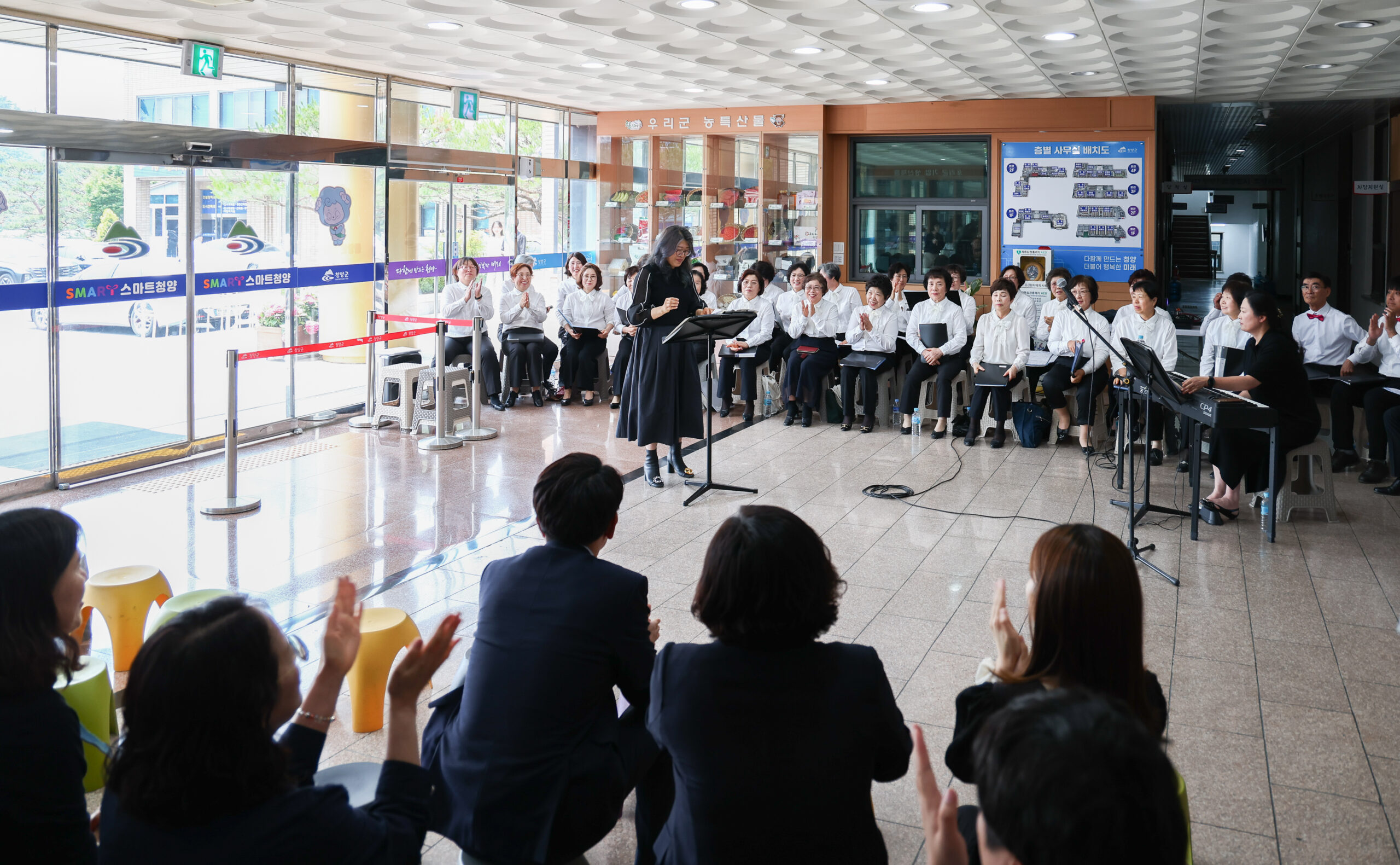 청양군립합창단이 28일 정오부터 1시간 동안 청양군청 1층 중앙현관(로비)에서 봄맞이 거리 공연(버스킹)을 펼쳐 군청을 방문은 군민들과 공직자들에게 봄의 정취와 함께 깊은 감동을 선사했다. 이번 공연은 ‘아름다운 한국 가곡 맛보기’라는 주제로 기획돼...